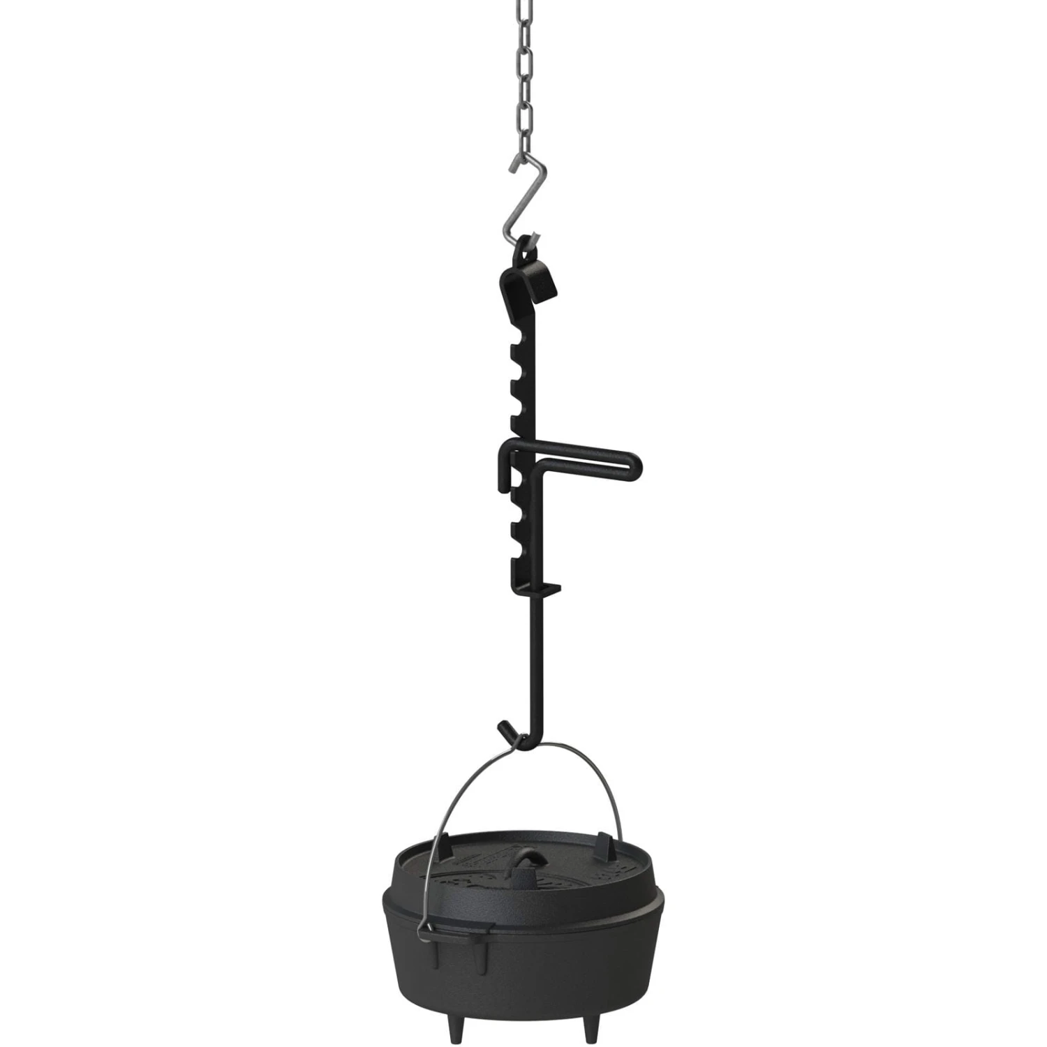 Der Petromax Kesselhaken aus beschichtetem Stahl bringt das bereits seit dem Mittelalter überlieferte Prinzip des Hakens in die moderne Draußen-Küche. An der massiven Halterung kann man selbst schwere Kessel und Töpfe zuverlässig über das Lagerfeuer hängen. Mittels der sieben Zähne der Kesselsäge wird beim Draußen-Kochen im wahrsten Sinne des Wortes auch mal ein „Zahn zugelegt“. Sie ermöglicht es, den Abstand zwischen Topf oder Kessel zum Feuer und somit die Gartemperatur der Speisen bequem zu variieren. Dank der praktischen Aufhängung – einer Kombination aus Öse und einer Biegung – kann man den Kesselhaken sowohl an einem Dreibein als auch an der Querstange der Kochstelle über dem Feuer befestigen. Durch die untere Führung der Vorrichtung kann sich die Säge während des Gebrauchs nicht herauslösen – sicheres Draußen-Kochen ist so garantiert. Bitte beachten Sie, dass sich die Pulverbeschichtung während des Gebrauchs ablösen kann. Die Funktion des Kesselhakens wird davon nicht beeinträchtigt.